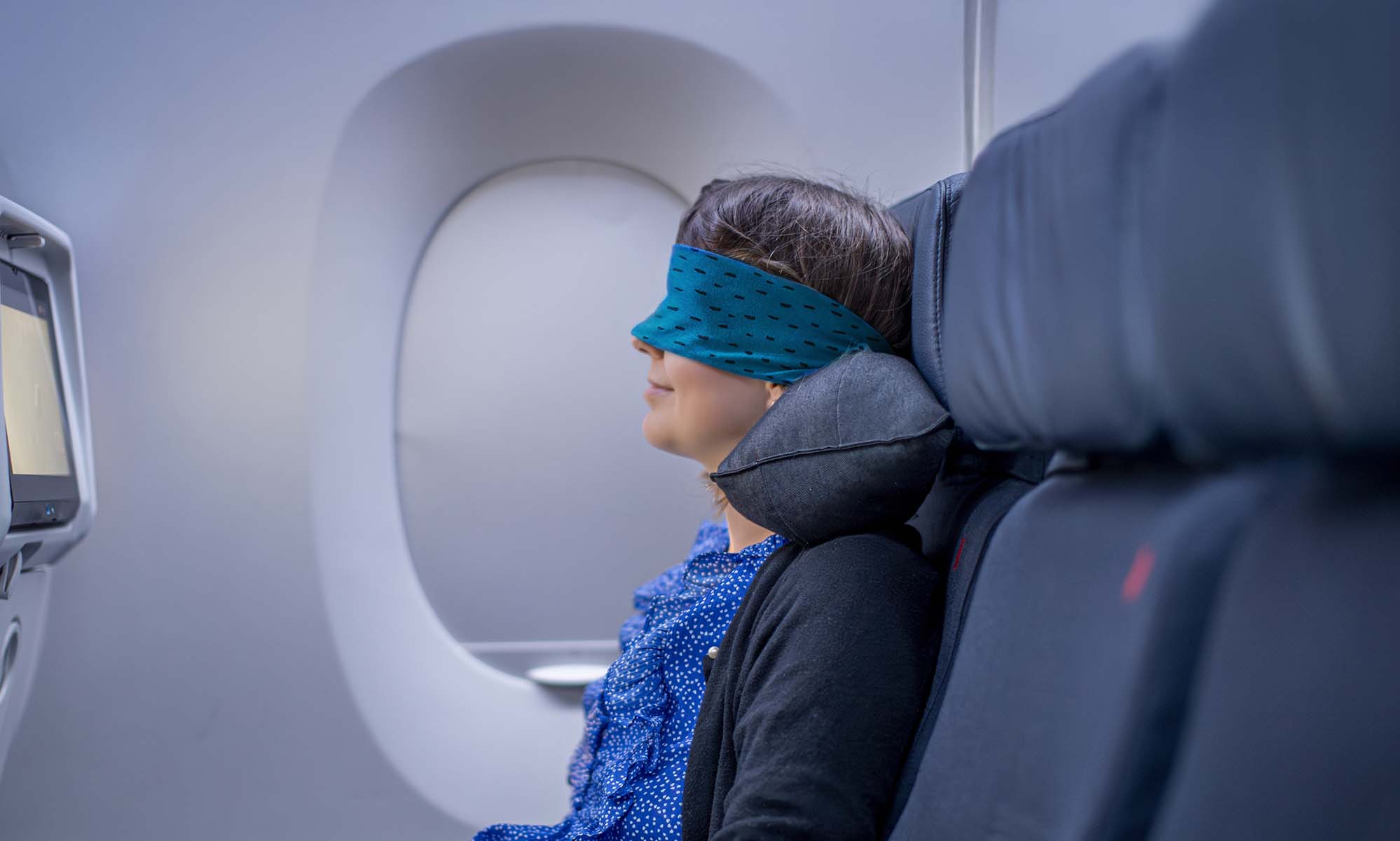 Mit integrierter Schlafmaske und optimaler Nackenstütze – für erholsamen Schlaf unterwegs.